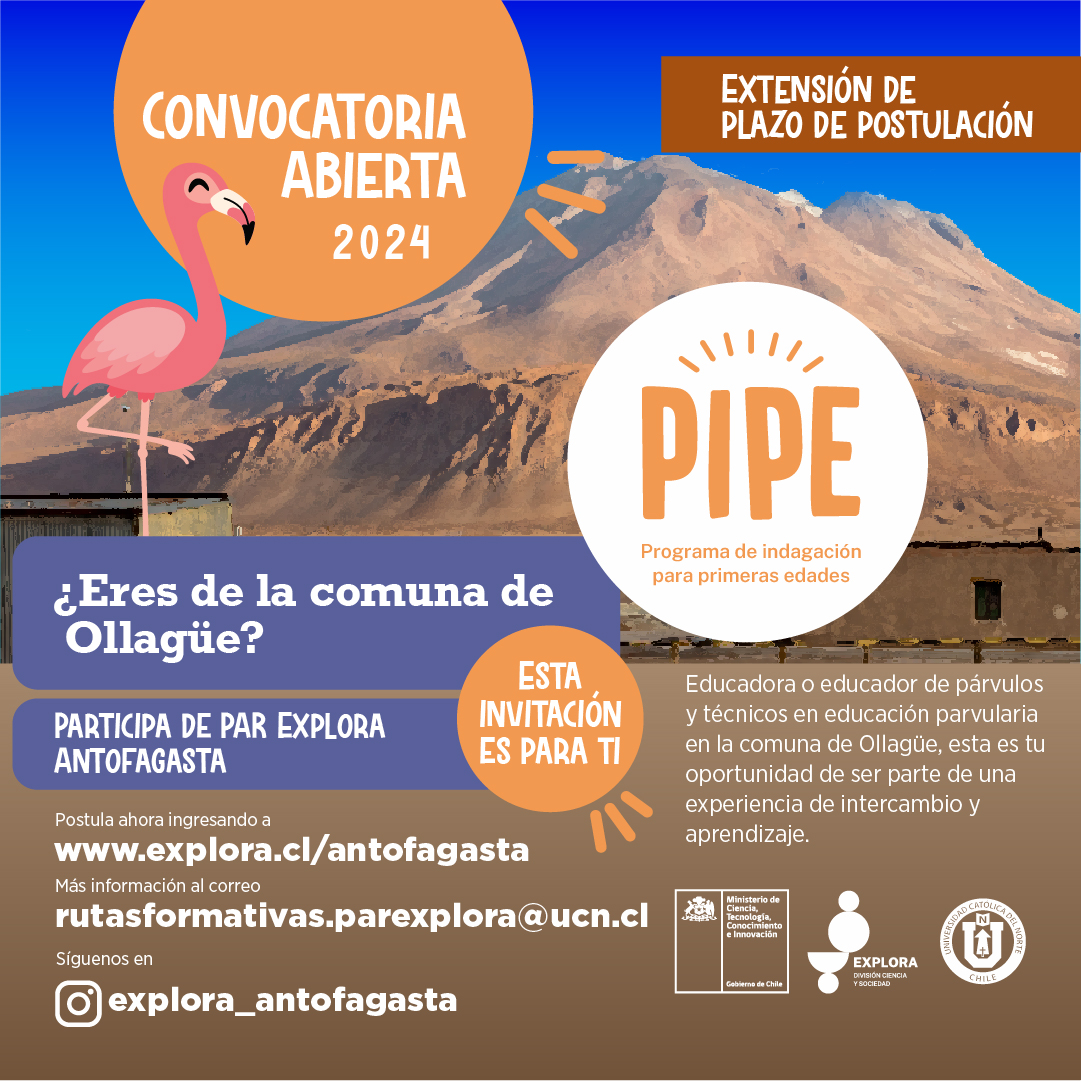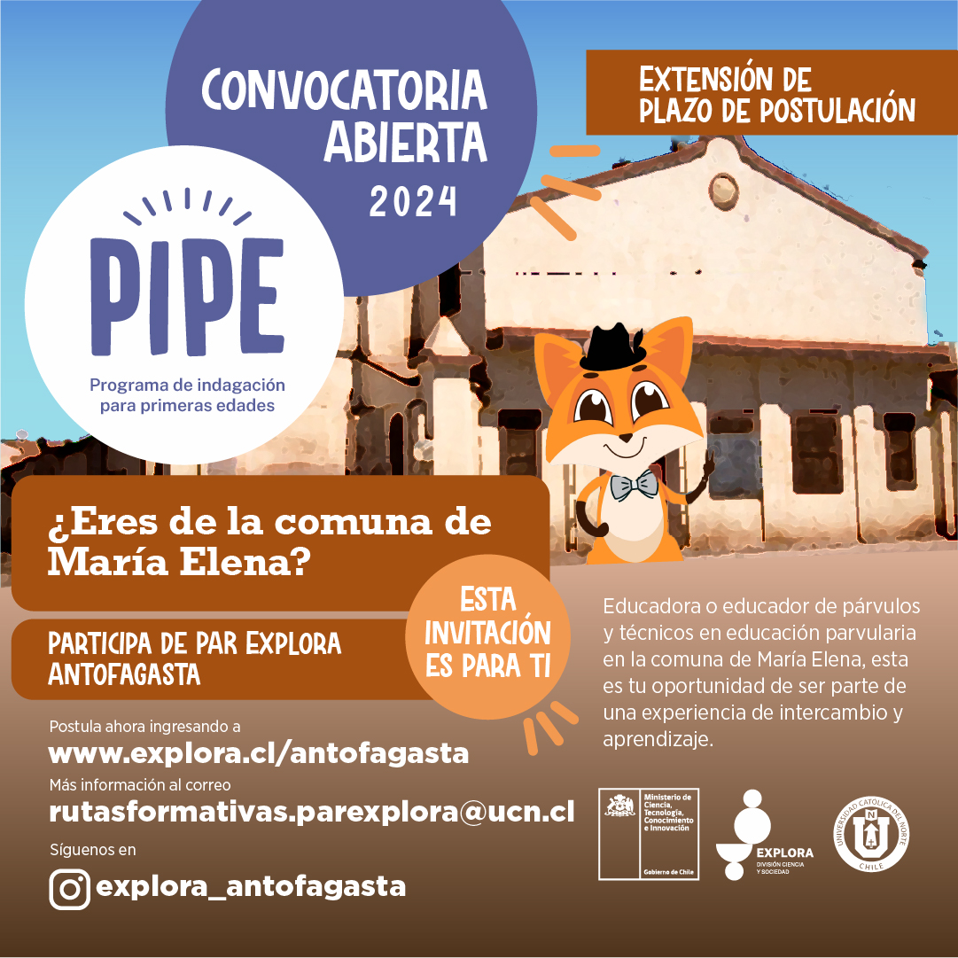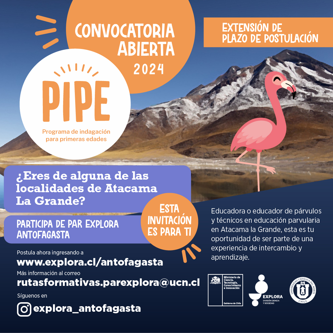 Durante el mes de abril, Educadoras/es y Técnicos/as en Educación Parvularia de la Región de Antofagasta tienen la oportunidad de postular al Programa de Indagación para Primeras Edades (PIPE 2024). Esta iniciativa, liderada por el Proyecto Explora Antofagasta del Ministerio de Ciencia, Tecnología, Conocimiento e Innovación y ejecutada por la Universidad Católica del Norte (UCN), busca impulsar la innovación en las aulas mediante la integración de la ciencia, la innovación y la tecnología.