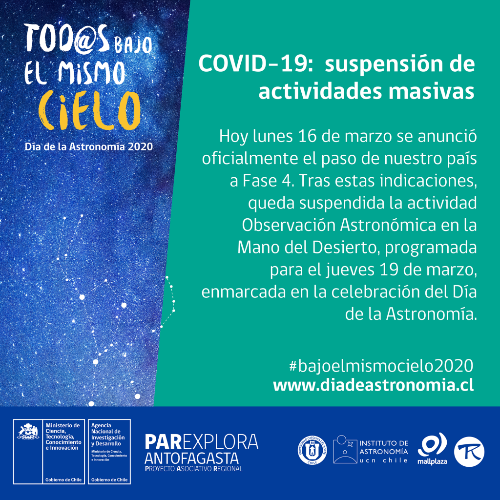 Informamos a la comunidad de la Región de Antofagasta que, debido a la contingencia por el Coronavirus COVID-19, se ha suspendido la Observación Astronómica en la Mano del Desierto, actividad programada para el jueves 19 de marzo, en el marco del Día de la Astronomía.