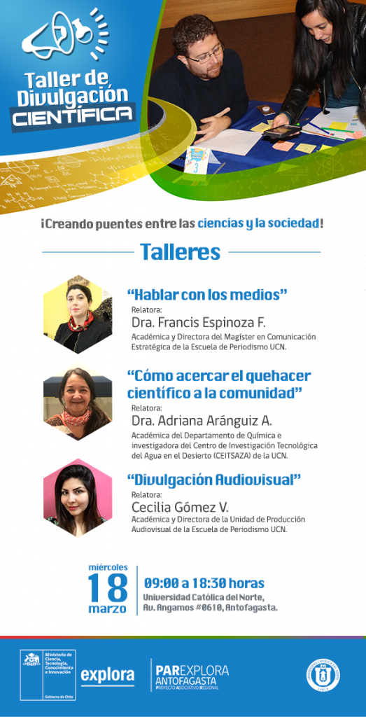 Invitamos a la comunidad académica, investigadores/as y personas que deseen desarrollar sus habilidades para divulgadores/as de las ciencias, a inscribirse en el Taller de Divulgación Científica, actividad organizada por PAR Explora Antofagasta.