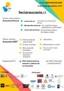 La parrilla de FECI Araucanía, este año estará dividida en talleres “Araucanía 360°” y actividades de artes, ciencias y saberes “Araucanía Diversa”. Para el caso de los primeros, los participantes podrán aprender cosas tan variadas como transformar sus casas en lugares sostenibles y térmicamente eficiente, hasta conocer herramientas para realizar aplicaciones de celular; también se realizará un encuentro de literatura junto a María Lara y Guardianes del Sur, donde se podrá disfrutar de sus creaciones y reflexionar sobre la importancia de las letras en el diálogo intercultural entre las ciencias y saberes de la región.