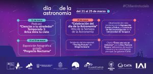 Este año Explora Arica y Parinacota, financiado por el MinCiencia, y ejecutado por la Universidad de Tarapacá, invita a la comunidad a celebrar el Día de la Astronomía con diversas actividades presenciales y virtuales. La fecha se conmemora a nivel nacional el próximo 21 marzo, a causa de la llegada del Equinoccio de otoño al hemisferio sur; razón por la que se pretende relevar la labor de astrónomas y astrónomos, el desarrollo de observatorios internacionales en nuestro país y la protección de nuestro cielo, invitando a niños, jóvenes y adultos a pensar en astronomía.