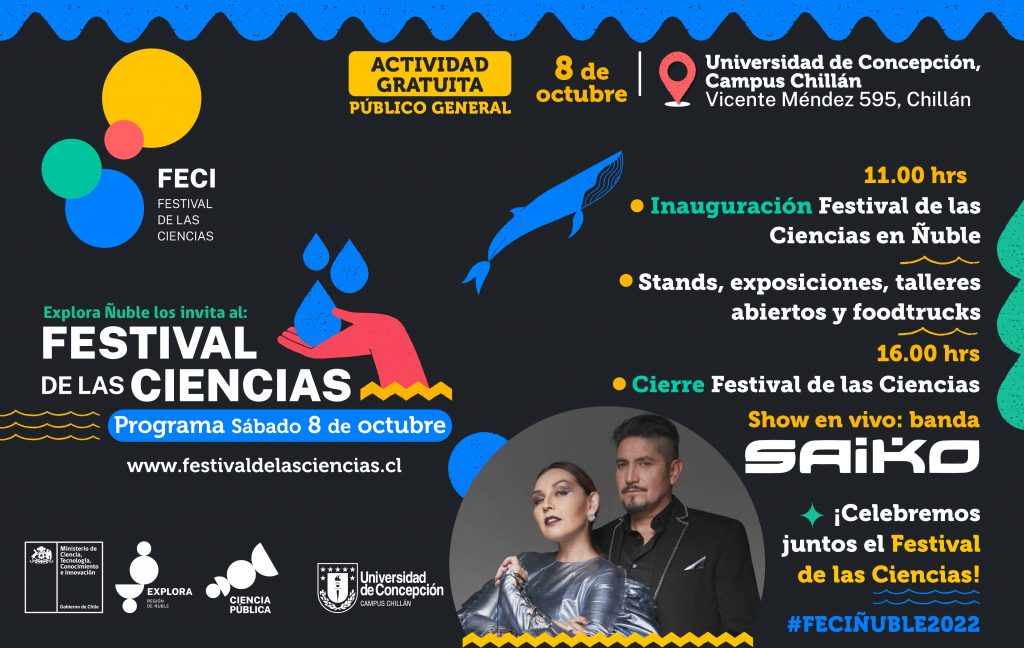 En el cierre de la celebración, contaremos con la actuación de la banda nacional “Saiko”, a las 16:oo hrs, con lo mejor de su repertorio para finalizar el Festival de las Ciencias en Ñuble 2022.