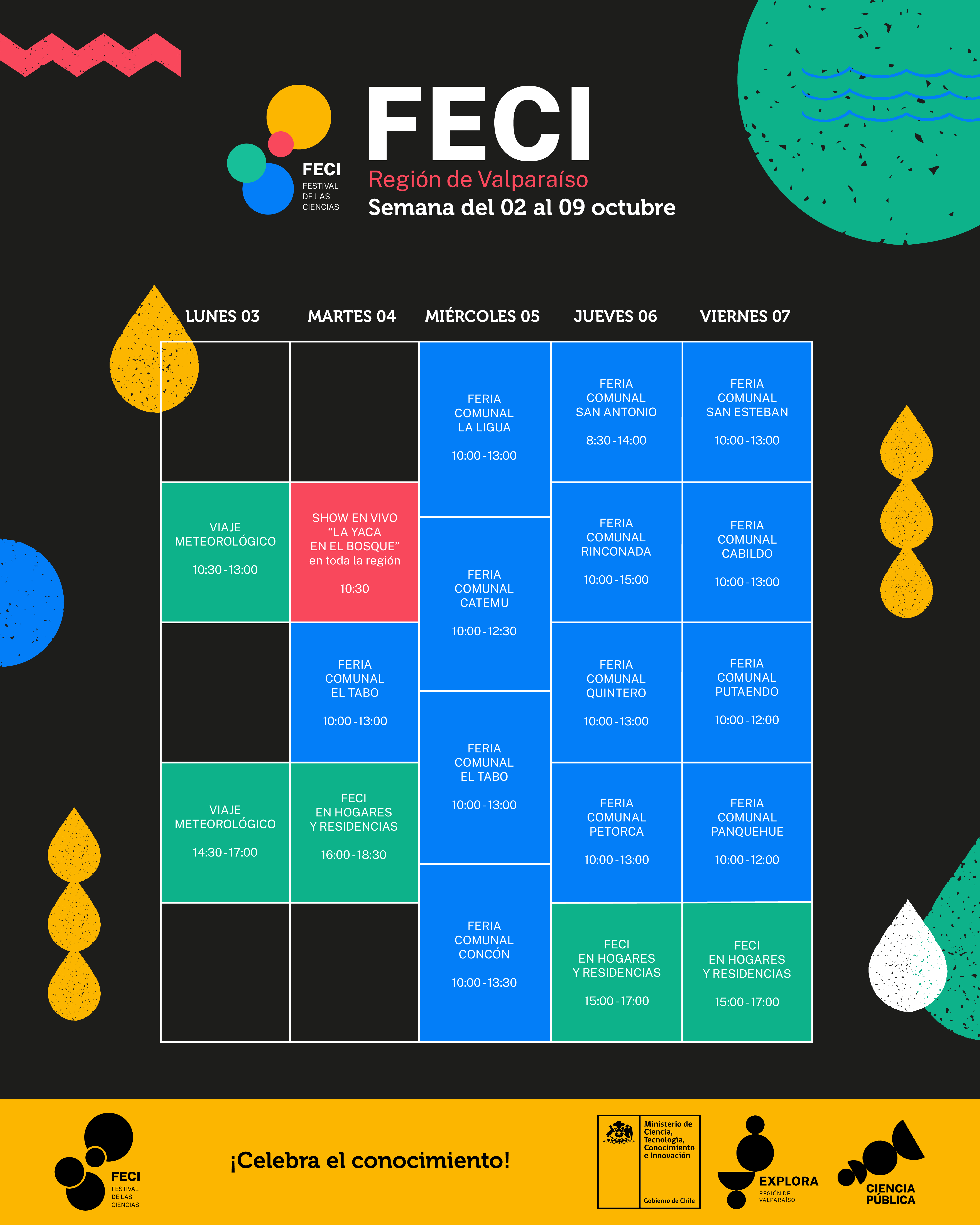 Para conocer detalles de FECI en la Región de Valparaíso sigue a @exploravalpo en Facebook, Twitter e Instagram; redes en la que estará disponible toda la información. Estaremos comunicando más detalles prontamente. Te dejamos con nuestro Line Up oficial y el calendario de “Festival de las ciencias en los territorios”